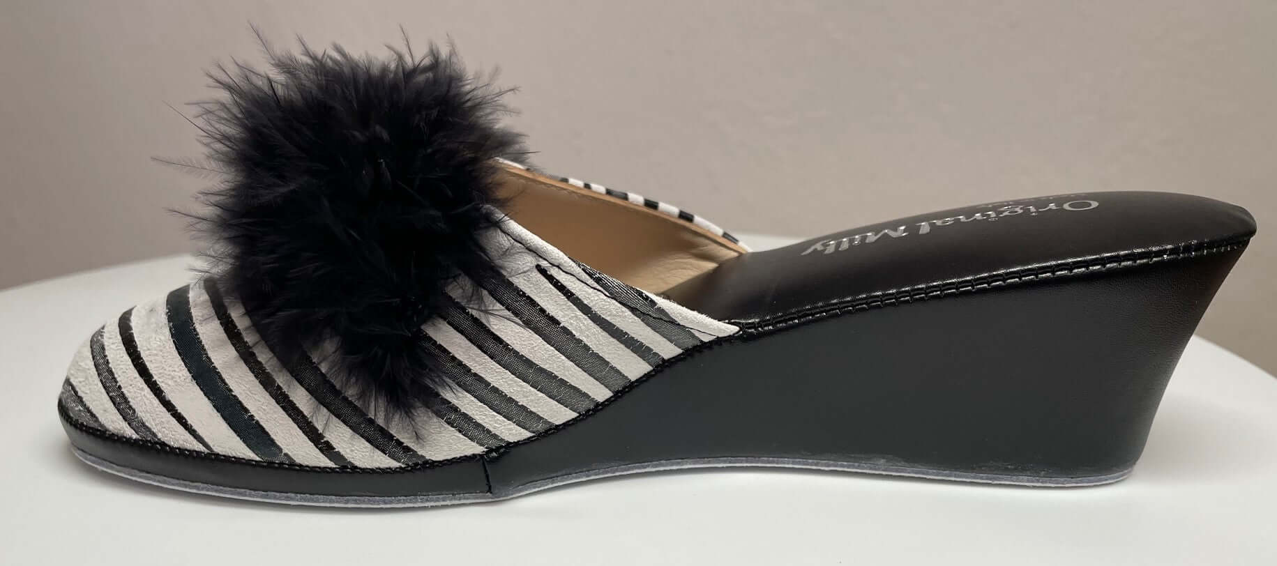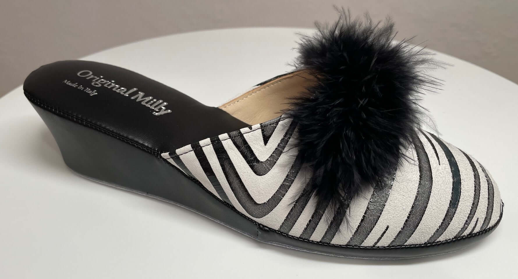 Prova l'avventura con le originali Milly 300 Zebrato Nero! La piuma nera e la suola di bufalo rendono queste ciabatte belle e comode, perfette per ogni sfida. Chiuso in punta per una calzata sicura. Artigianali e di alta qualità, con il loro design zebrato daranno un tocco audace al tuo look!